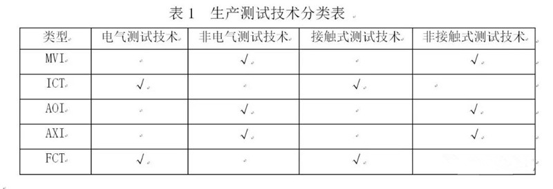 目前在電子組裝測試領域中使用的測試技術種類繁多,常用的有人工目視檢查(Manual Visual Inspection,簡稱MVI)、在線測試(In-CircuitTester,簡稱   ICT)、自動光學測試(AutomaticOptical Inspection,簡稱 AOI)、自動 X 射線測試(AutomaticX-ray Inspection,簡稱AXI)、功能測試(Functional Tester,簡稱 FCT)等。